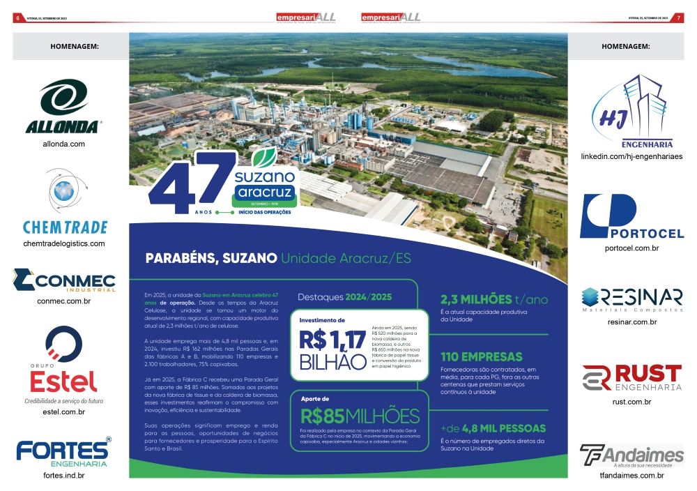 - Um aporte de R$ 85 MILHÕES foi realizado pela empresa no contexto da Parada Geral da Fábrica C no início de 2025, movimentando a economia capixaba, especialmente Aracruz e cidades vizinhas;
