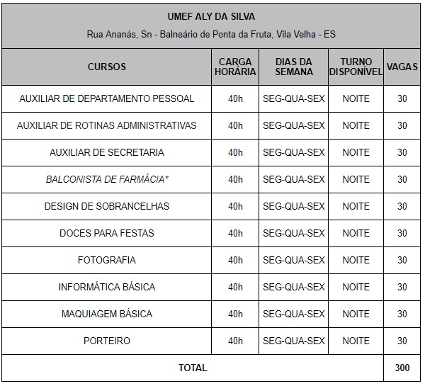 As vagas são para todos os moradores da cidade, sendo preferenciais aos moradores do Balneário Ponta da Fruta e de São Torquato, que atendam aos requisitos de cada edital: residir em Vila Velha, ter mais de 18 anos nos cursos da área da saúde e mais de 16 anos nos demais cursos. As inscrições terminam no próximo domingo (12) e devem ser feitas no site www.oportunidades.es.gov.br. A seleção será por ordem de inscrição e o resultado será divulgado no site do projeto no dia 15 de agosto.