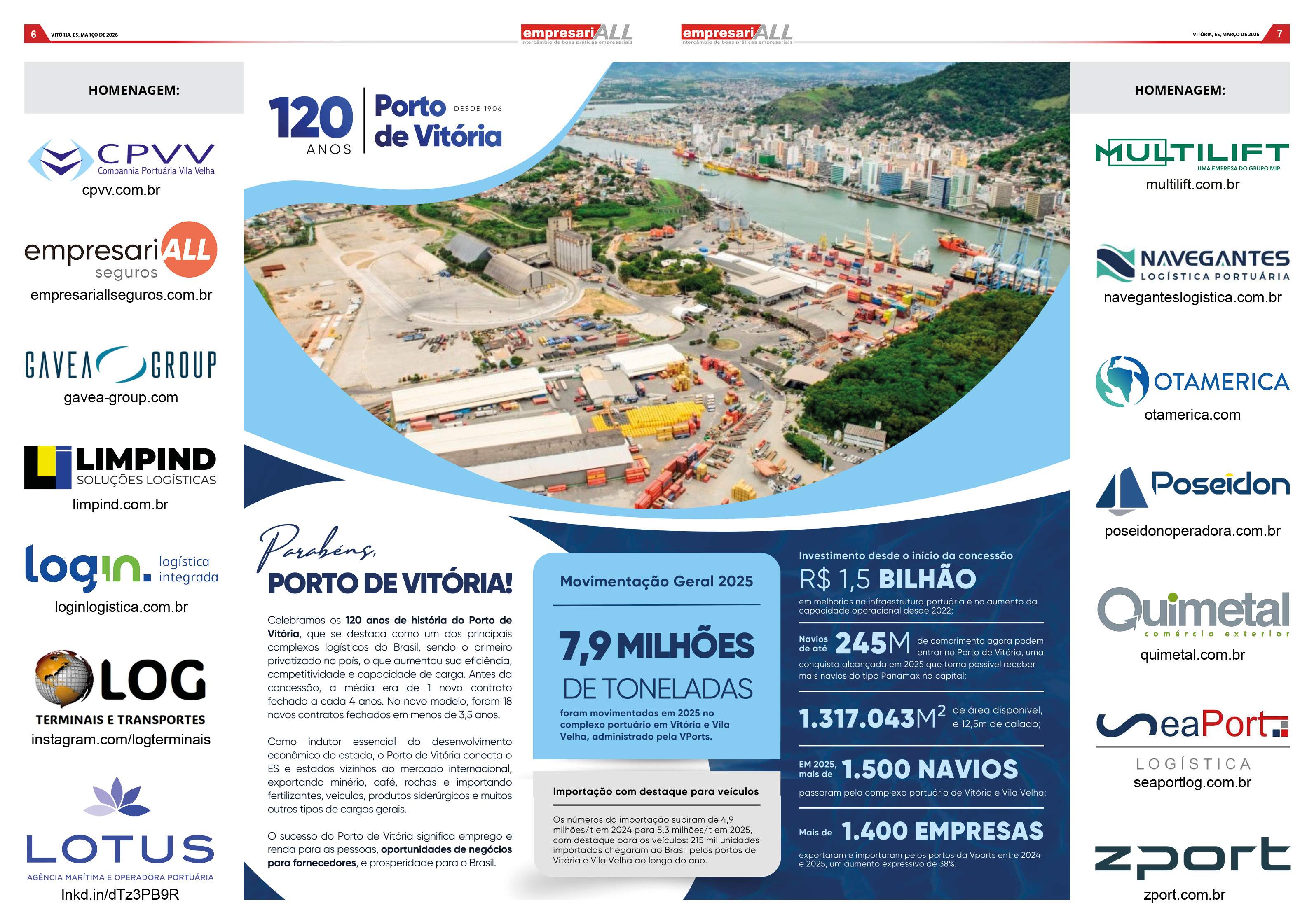 Celebramos os 120 anos de história do Porto de Vitória, que se destaca como um dos principais complexos logísticos do Brasil, sendo o primeiro privatizado no país, o que aumentou sua eficiência, competitividade e capacidade de carga. Antes da concessão, a média era de 1 novo contrato fechado a cada 4 anos. No novo modelo, foram 18 novos contratos fechados em menos de 3,5 anos. Como indutor essencial do desenvolvimento econômico do estado, o Porto de Vitória conecta o ES e estados vizinhos ao mercado internacional, exportando minério, café, rochas e importando fertilizantes, veículos, produtos siderúrgicos e muitos outros tipos de cargas gerais.
