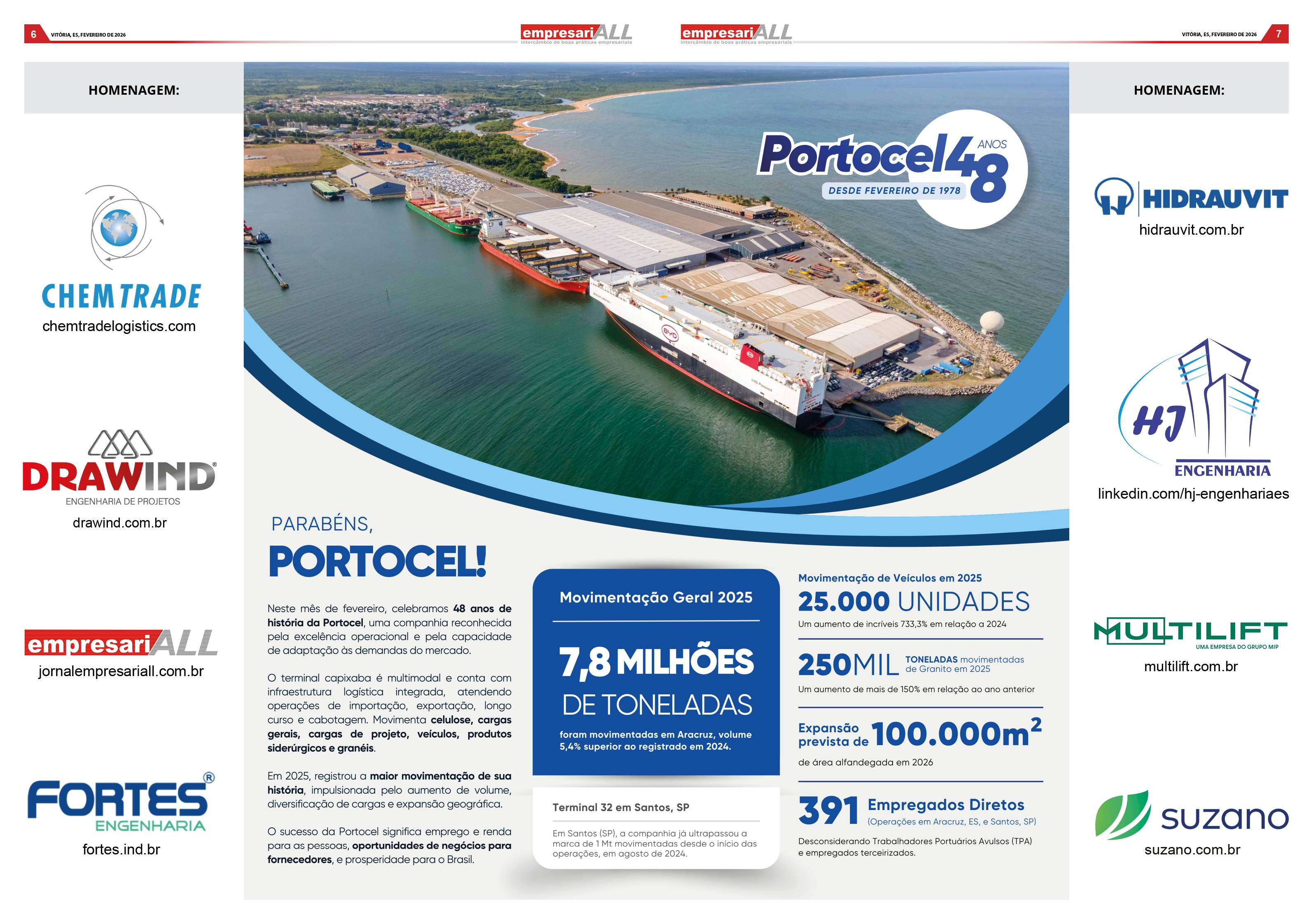 - 7,8 Milhões de toneladas foram movimentadas em Aracruz, volume 5,4% superior ao registrado em 2024.